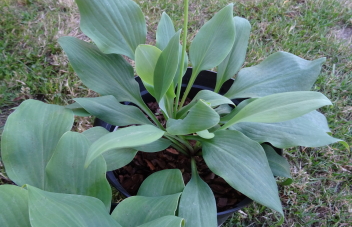 are light lime green with heavy substance, slightly wavy, low and spreading. The colour varies according to environment, ours looks blue as it is in deeper shade. Alternative: H. 'Goldbrook Grayling' |