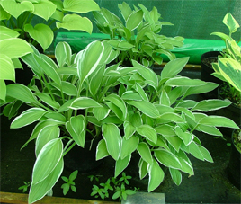 Medium green oval leaves with white margins, rapid grower.