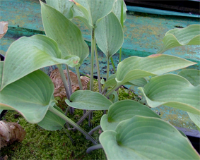 | Beautiful glaucous blue, slightly wavy edged, long leaves on pink petioles. | |||||