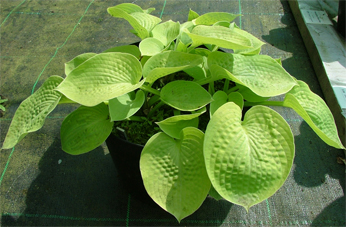 | The dark green leaves are edged in gold and have great substance. They are corrugated, puckered and slightly cupped which creates a very pleasing sight. Variegation can be very subtle. | |||||