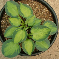 to round, puckered yellow leaves with a wide blue-green margin. Slow grower. Alternative: H. 'Bright Lights' |