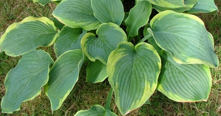 | Non-scortching, gold-edged blue, in giant class with wavy margins. Margins brighten as season progresses. Alternative: H. 'Gilt Edge' |